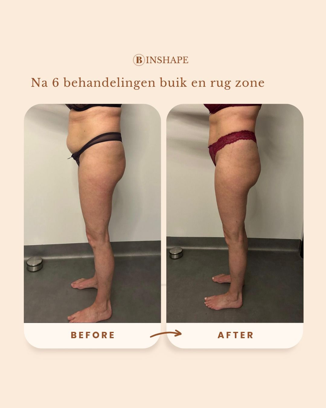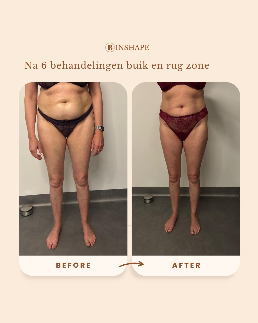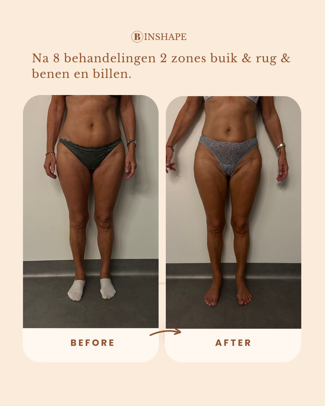 Direct! Na één behandeling zie je al zichtbaar verschil. Je silhouet oogt strakker, vetophopingen zijn verminderd en je huid voelt steviger aan. Je krijgt dat zelfverzekerde gevoel in je eigen lichaam terug.